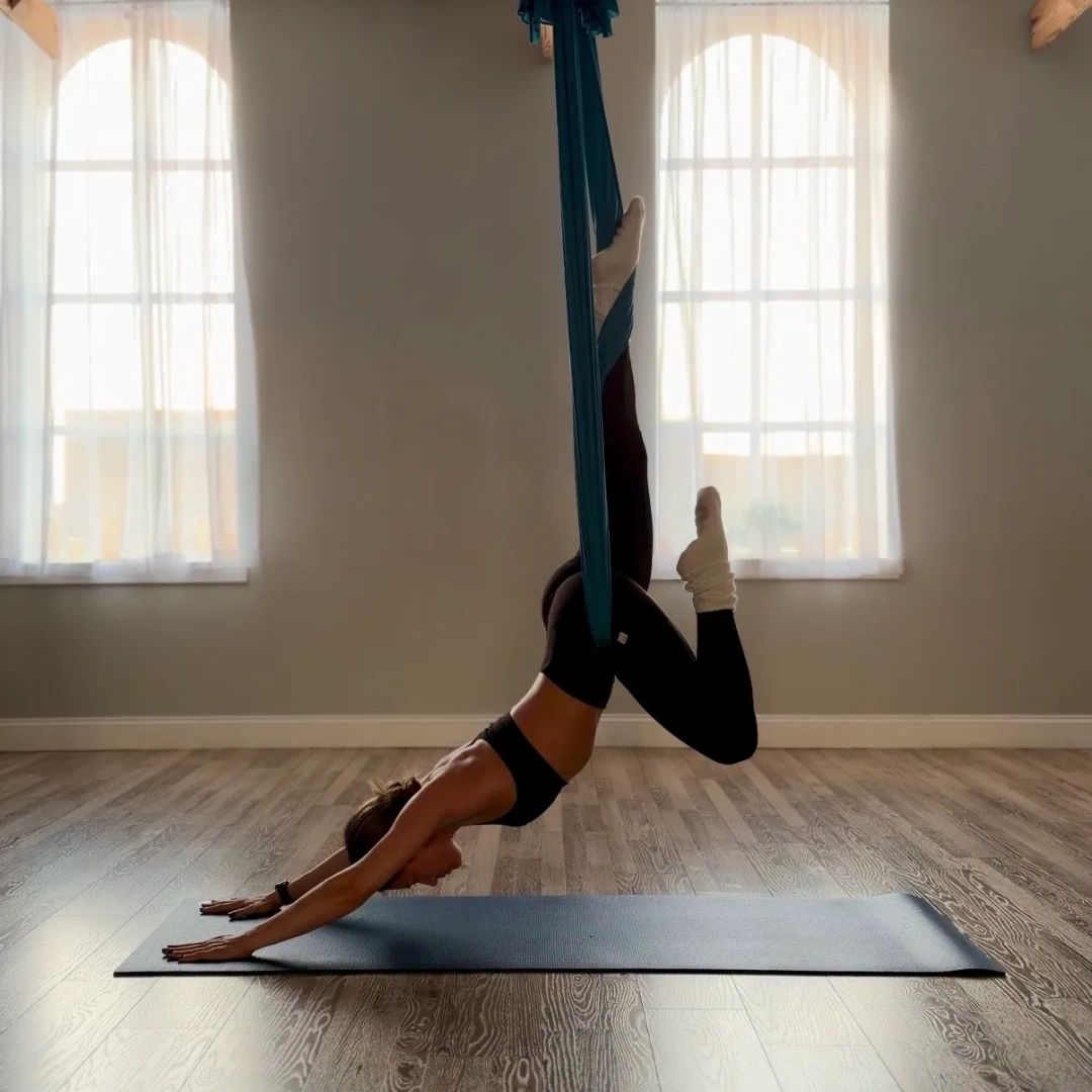 Aerial yoga is a great way to add to your yoga routine! It uses fabrics hung low to aid in yoga practice. The aerial sling/fabric is a supportive and sometimes challenging tool to explore familiar traditional postures, as well as learn some new poses!
