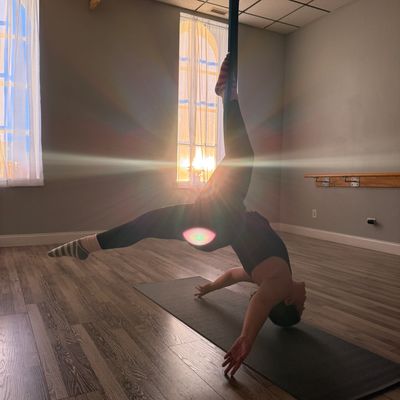 The aerial sling is a supportive and sometimes challenging tool to explore old and familiar postures, as well as learn some new poses.